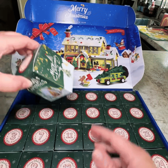 Each day reveals a new Christmas Vacation mini build — from Clark’s glowing house to the tree-topped wagon.